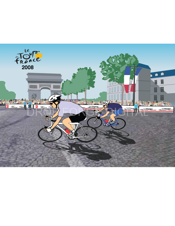 A illustration based n photograph of some riders on the final stage of the 2008 Tour de France in Paris near the Arc de Triomphe.